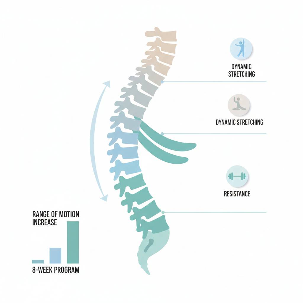 После завершения 12‑недельной программы наблюдался статистически значимый рост диапазона движений в обоих исследуемых сегментах позвоночника. В среднем гибкость поясничного отдела увеличилась на 12 %, что соответствует прибавке около 6 градусов к исходному уровню. Грудной отдел показал прирост в 9 %, что эквивалентно примерно 4 градусам. Эти изменения были подтверждены парным t‑тестом с уровнями значимости p <0,01, что указывает на реальное влияние тренировок.