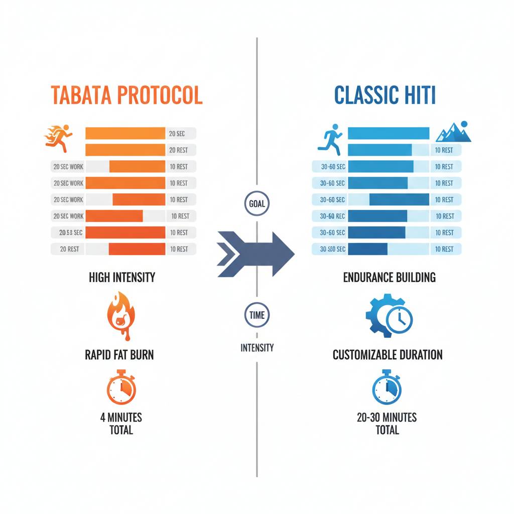Классический HIIT (High‑Intensity Interval Training) - это более широкий набор методик, где длительность и интенсивность можно подбирать под индивидуальные цели. Наиболее распространённый вариант: работа 30‑90 секунд с нагрузкой 70‑85 % HRmax, последующий отдых 60‑180 секунд. Количество раундов варьируется от 4 до 12, а общая продолжительность сессии обычно составляет 20‑30 минут.